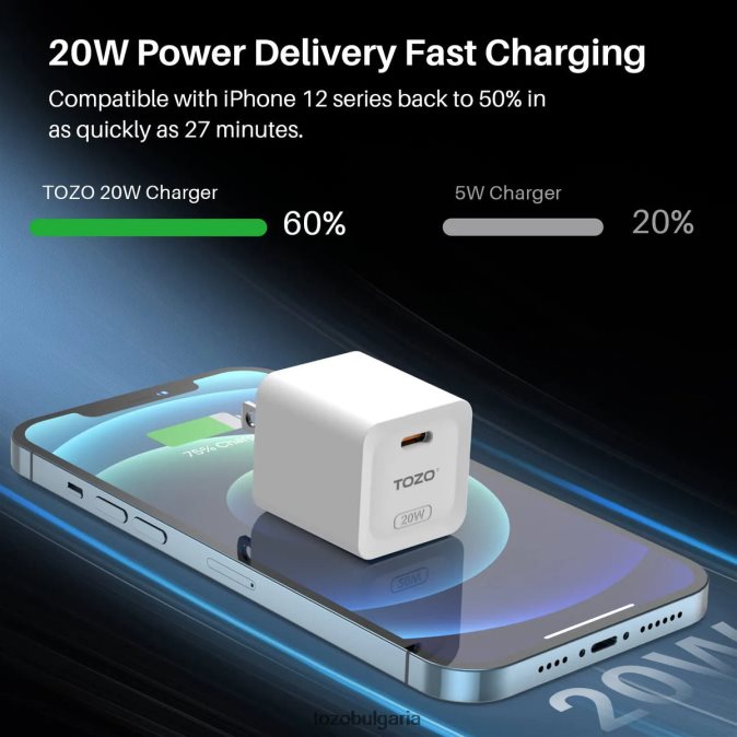 - високоефективно зарядно за стена usb c:мощен 20w pd изход за бързо зареждане. съвместим със серия iphone 12/13, достигайки 50% само за 27 минути.