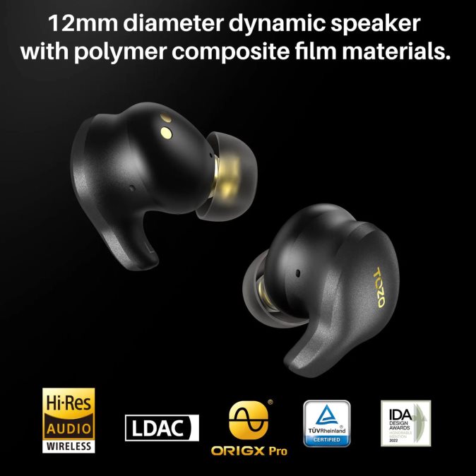 tozo golden x1 използва комбинация от 12 мм динамичен драйвер и персонализиран балансиран арматурен драйвер на Knowles, осигурявайки слушане на ниво hi-fi с ултраширок диапазон на честотната характеристика от 12 Hz до 44,1 khz, който далеч надхвърля обхвата на слуха ви. той също така поддържа ldac аудио декодиране с висока разделителна способност и е получил сертификат за аудио с висока разделителна способност.